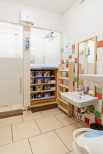 In unserem Wickelraum findet die tägliche Pflege der Kinder statt. Hier befinden sich eine kindgerechte Toilette, ein Töpfchen, ein Wickeltisch mit kindgerechter Leiter und ein Waschbecken auf Kleinkindhöhe, die den Kindern Selbstständigkeit zugestehen und ermöglichen. In einem großen Spiegel können sie sich beim Saubermachen nach dem Mittagessen betrachten.